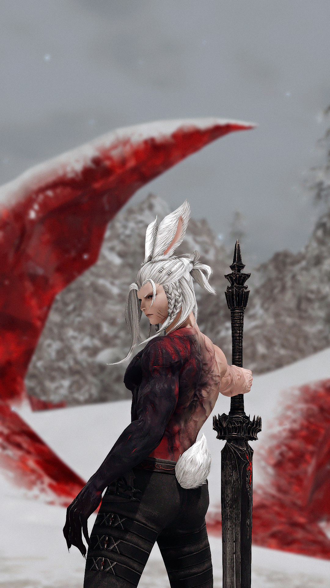 His name is Ezekiel Carus, a Garlean given name. A male Veena Viera that appears in his mid-thirties to forties, though he has lived for much, much longer.Pale, stoic eyes that sometimes look red in the right lighting due to his albinism. He is broader and taller than most Viera, male or Female, standing at 214cm (7ft), plus some, given his ears.- Sexuality: Bisexual, but holds no preference. Uncomfortable with commitment, but not unwilling. Unromantic, but not unwilling. He just doesn’t know how.- Alignment: Mixture between Chaotic and Lawful Neutral/Good? He tries to be good, but he's not always great at that. He's a short temper and can be quick to lash out against others.- Distinguishing Marks: Zeke is littered in the scars of combat, a man who has seen many a weapon raised against his body and come out the other end. Has oculocutaneous albinism, so he lacks pigment in his eyes, hair and skin.- Common Accessories: One very big sword. Wears a helmet/visor that is of Garlean/Magitek origins. Dog tags under shirt, rarely shows them in public.